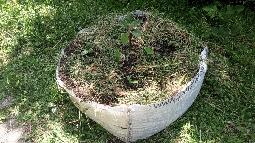 Na srečo še nisem porabila vsega komposta iz letos nabavljenega BigBag-a, pa tudi lansko BigBag vrečo sem še vedno imela doma. Vrečama sem odrezala zgornji del, ju položila na tla poleg vrtnih gred in napolnila s kompostom. V prvo sem posadila štiri cukete, na sredo pa jajčevec, v drugo pa sredi julija dva jajčevca in osem paprik iz rastlinjaka. Vsi, še posebej pa paprike (saj so bile že kakšen meter velike in takšne sadike težje prenesejo presajanje) so dobili po dve pesti biooglja v sadilno jamico, zalila sem jih še z raztopino Epsomske soli in zastrla tla pod njimi z zastirko.